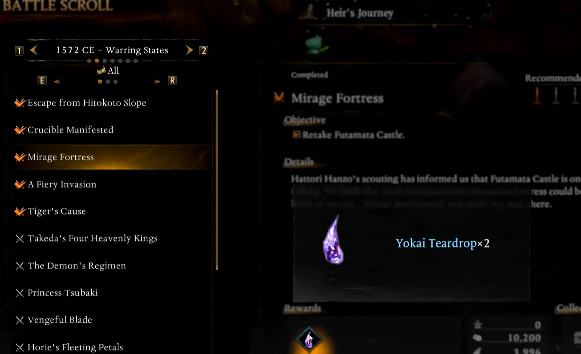 Another source of Yokai Teardrop comes from completing battle scroll missions. From the battle scroll you can choose any of the quest or side quest of your choice and recommended level. On the completion of these battles scroll missions you get Yokai Teardrop as rewards.