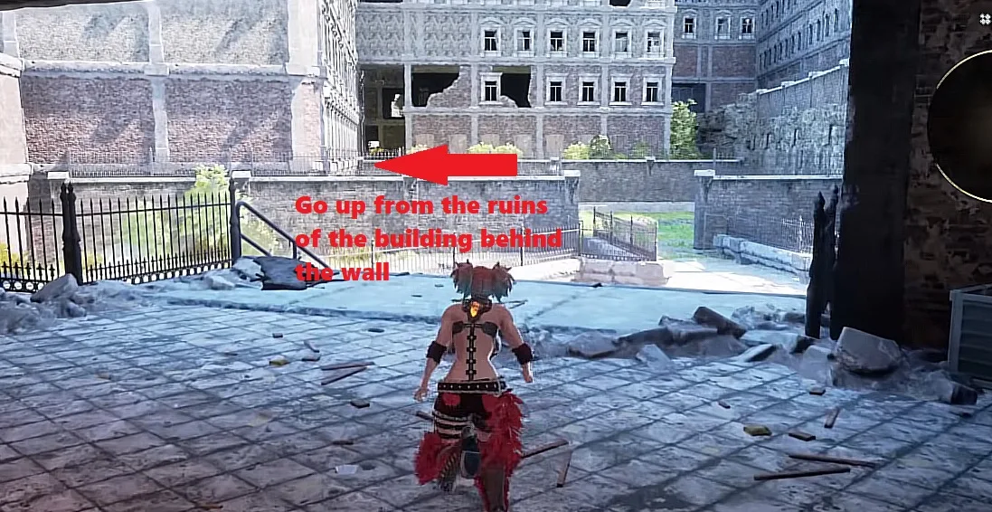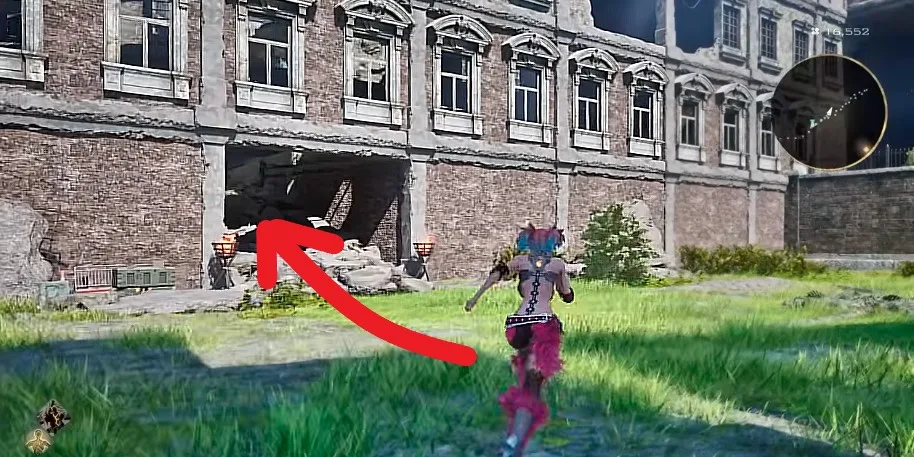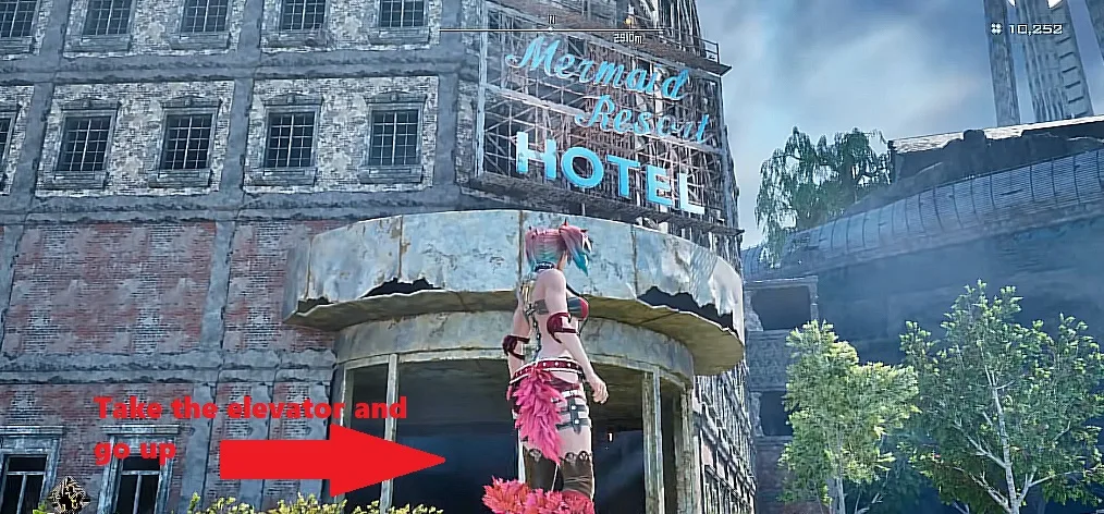 First go inside the hotel building and take the elevator upward. There is an open area to your right where you can register a save point as well. To its left there is a collapsed building with a small entrance in it. Go inside that fallen building and climb up the ladder to your right.