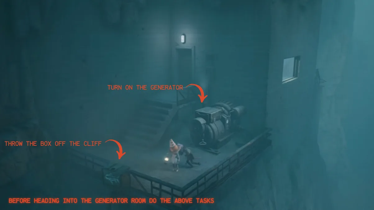 Once you are outside the generator room make sure to turn on the generator and thrown the box off the cliff that is necessary for the later part in the game