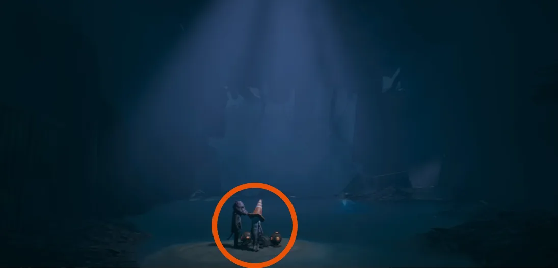 As part of main story after escaping from a monster and exploding mines you will eventually wake up a giant whale from sleep. After the cutscene when you regain control there are two unique masks lying on the ground.