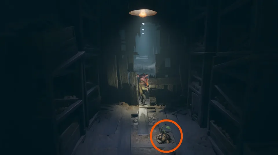Instead of going straight ahead head towards the camera and there is a hidden area behind the broken wooden pylons. On the other side there are some potatoes on the floor. Yank at those potatoes and then interact with them again to get the Potato Mask.