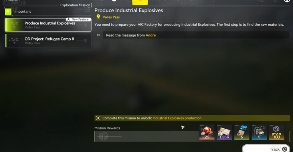 The ability to start crafting industrial explosive is introduced as part of the exploration mission “Produce Industrial Explosives” by Andre. Read his message and the side mission will start. To get this mission you need to finish the Project: Refugee Camp I and sub-quest (Lucky Carrot / Restart Area Stock Redistribution I) and have Authority Level 14.