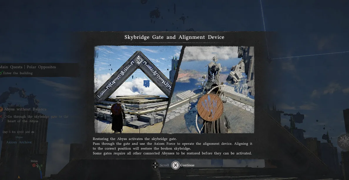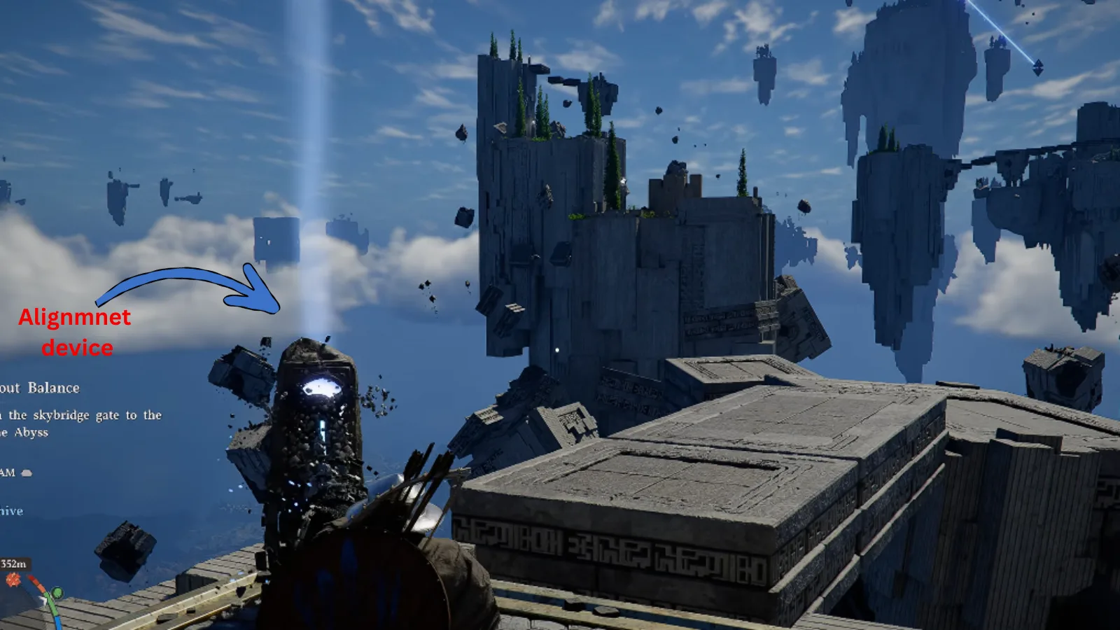 Right after a small cut scene, you will be standing Infront of skybridge gate. Walkthrough the gate to go to the heart of Abyss and start the quest “Abyss without Balance” in Crimson dessert. Right ahead of it is an alignment device, use the axiom force to align it in the correct position. Correct alignment will restore the skybridges.