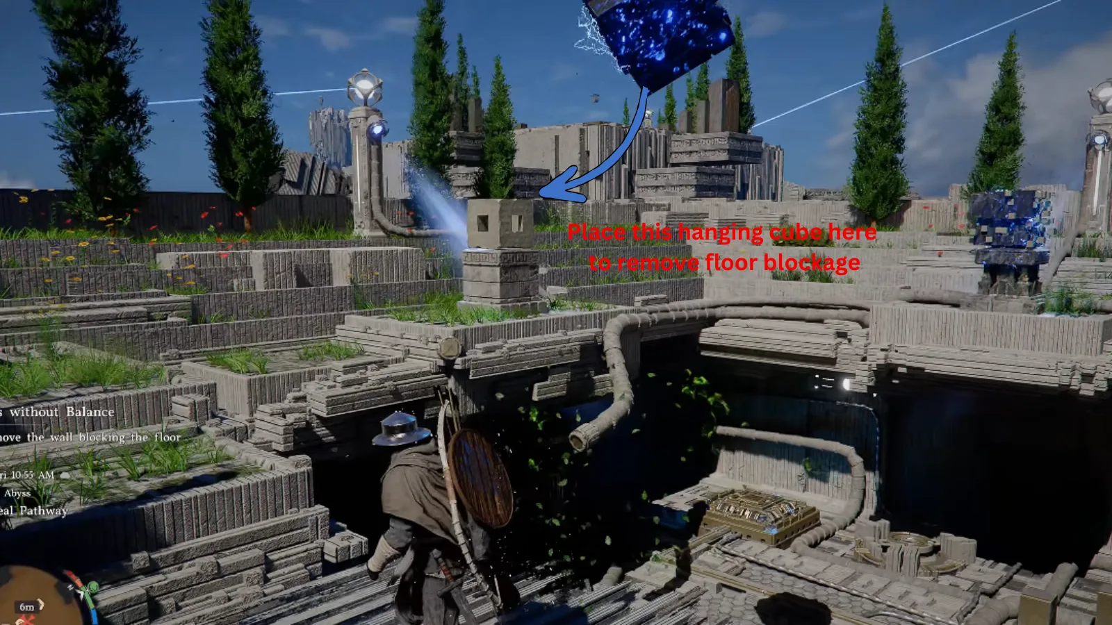 To remove the wall blocking the floor, place the hanging cube on the left side of the pillar by using Axiom force that you learned from Witch Crow at the start of the Abyss.