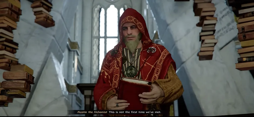 Upon entering the Alchemist room, you will find out that no one is there. Look around the room to search for any further clues. While searching around in the room you will find a hidden passage by open the chest in the room. Enter the glowing door that appears on the wall. After a small cutscene you will reach Library of providence Infront of you. Walk towards the dome shape building where you will find Alustin the Alchemist in it.