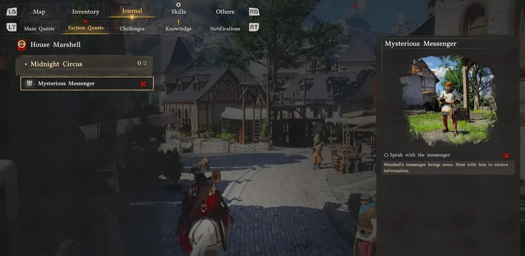 The objective is to speak with the messenger to retrieve information. Track his location, which is near the circus in Demeniss. Talk to him and he gives you a message from Lord Marshell and says: