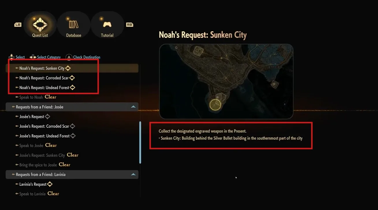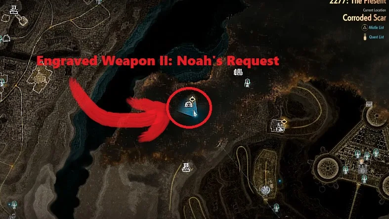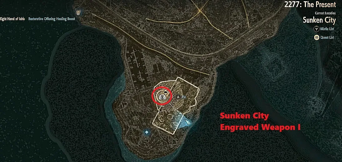 To get the first Engraved Weapon head in the far south direction of the sunken city. The location is not very difficult to access and you can get there. There are two ways through which you can reach the exact location to get the Engraved Weapon.