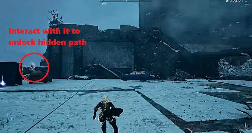 Continue going upwards until you reach an demolished building area, where in the parking beside a car you will see map jammer. Interact/Hit the map jammer to unlock a hidden area towards the Engraved Weapon III.