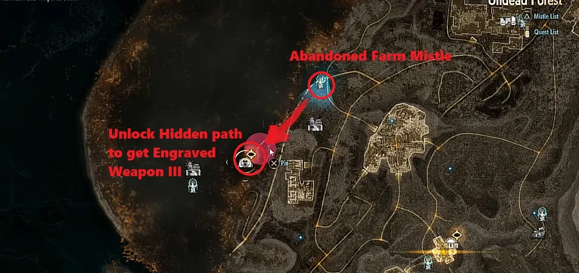 Return to the present after completing the past sequence that will unlock the uppwr portion of the undead forest. From there, use the Withered Greenhouse Mistle as a landmark, head northwest along the road, and reach the Abandoned Farm, where you’ll find its Mistle and the path toward the engraved weapon.