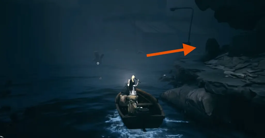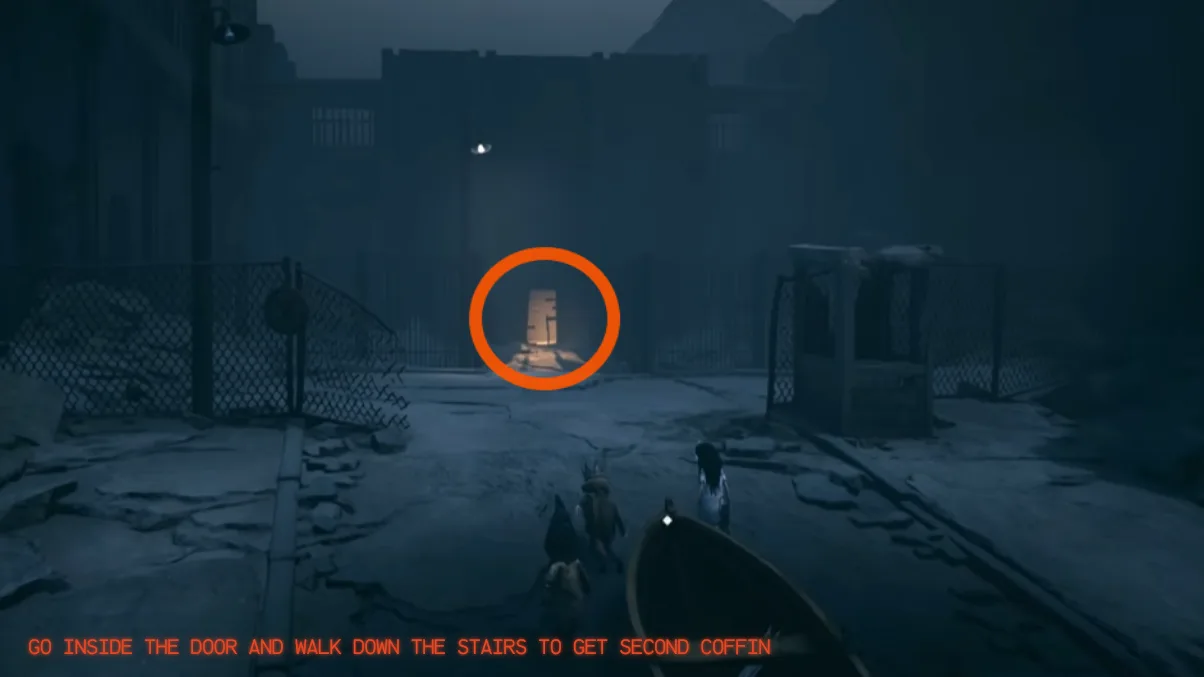 Once you leave the boat, you will see a door with light coming from inside. Go through the door, walk down the stairs, and you will find the second coffin at the bottom of the stairs (for reference see the images above)