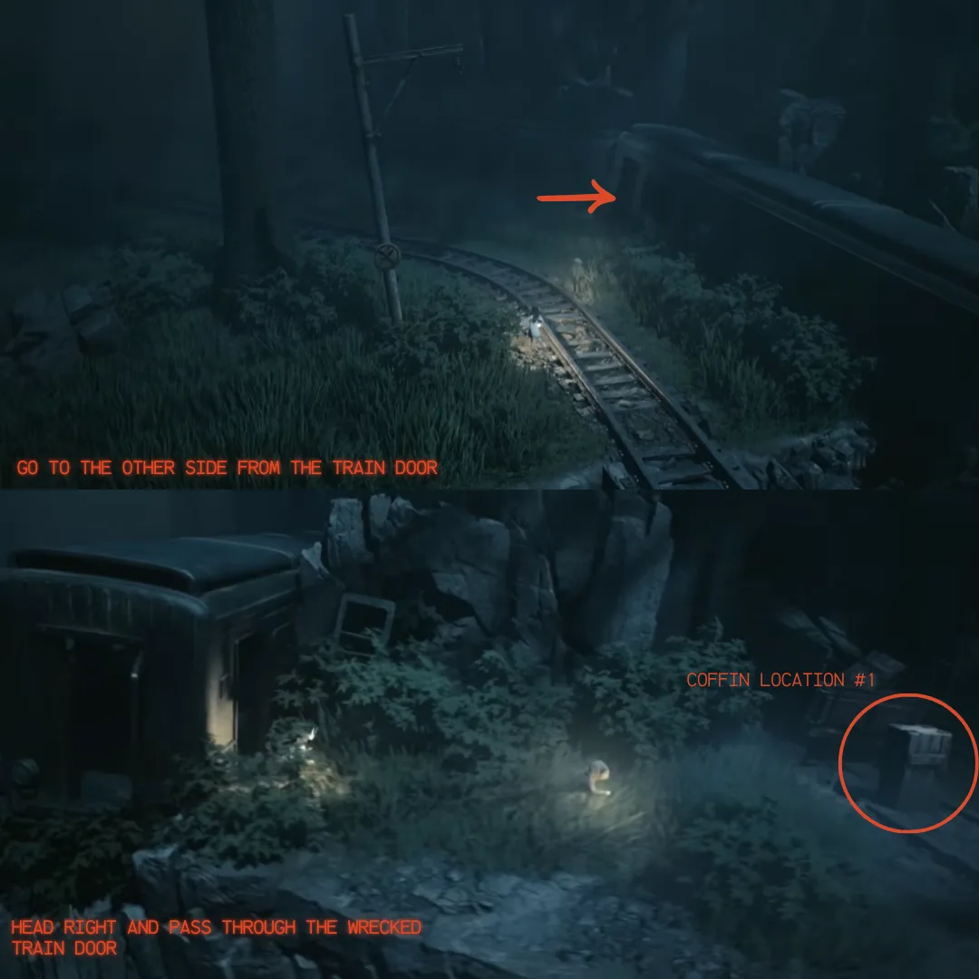 On your right side there is a wrecked train on this sidetrack, go to the other side using the door on the wrecked train and you will find first Coffin in ReAnimal.