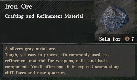 Iron Ore is a crafting material in Crimson Desert, and it is used to refine your gear at the Blacksmith. Iron Ore helps upgrade weapons, gear, craft armor plates, and metal shields. Iron Ore is a basic mineral resource mined from specific nodes across Pywel.