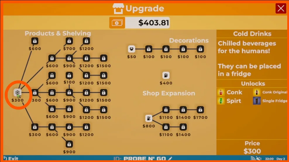 From the screen select Upgrade where you can see multiple option for the upgrade, but only one is unlocked right now for the first license shop upgrade and that is Cold Drinks for $300.