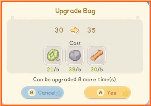 - A pop up will appear under the name of Upgrade Bag, giving details of the materials needed for the upgrade.