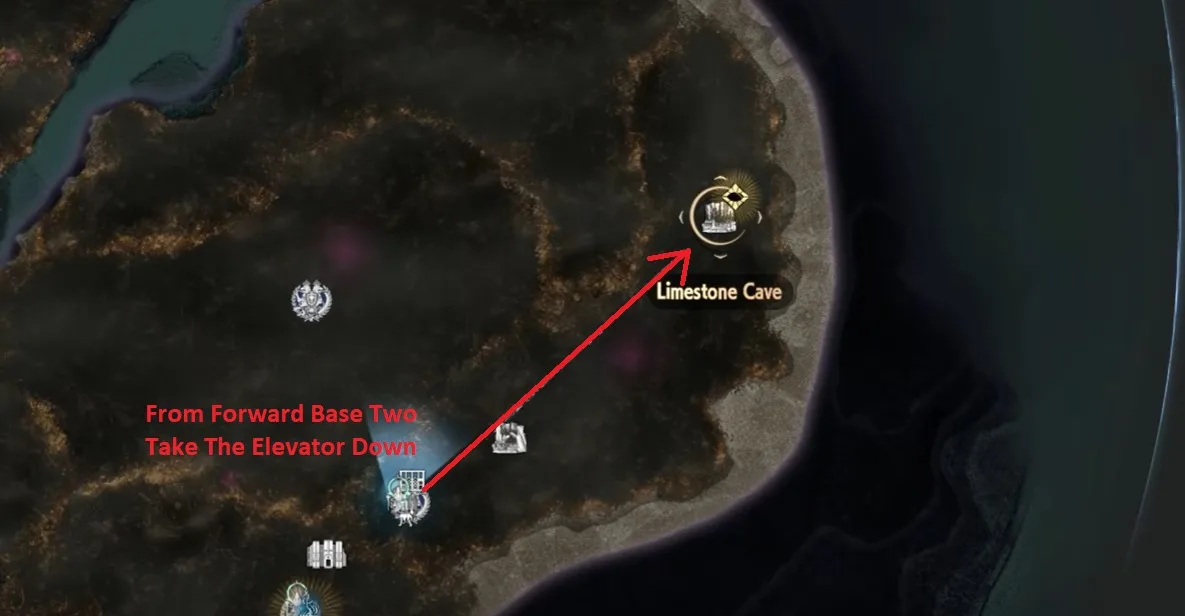 To the reach the limestone cave first reach the forward base two. From there take the south bridge elevator.