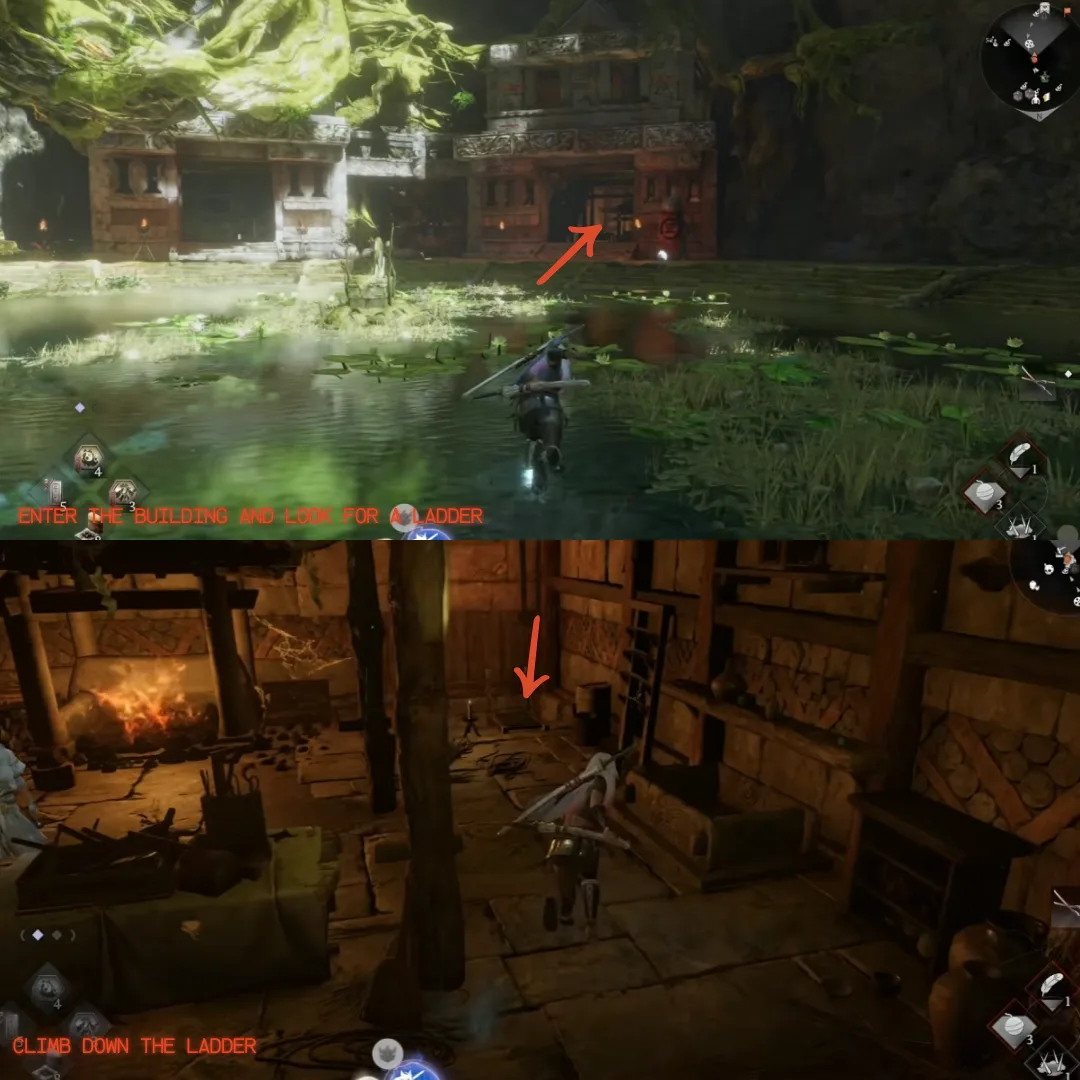 From that fast travel point head right into a small building and look for a hidden ladder in the room. Climb down the ladder and you will see a blocked path interact with it to reveal the hidden path.