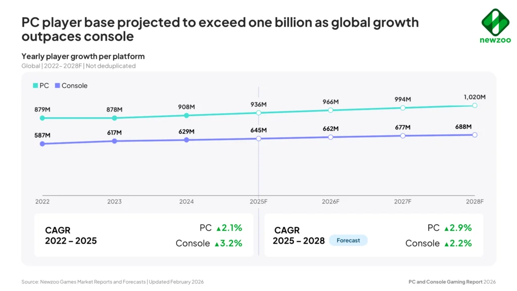In its 2026 PC and Console report, Newzoo found that PC revenue grew more rapidly in 2025 than console revenue, and forecasts indicate that the annual growth rate for PC gaming (~6.6 percent) will continue to exceed that of consoles (~4.4 percent) through the late 2020s. This shift follows years in which consoles dominated software sales.
