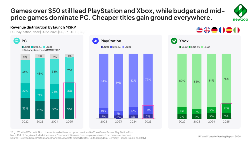 - The number of games priced below $30 generating more than $5 million in revenue increased from 17 in 2024 to 26 in 2025, reflecting the commercial impact of breakout titles and viral indie hits.