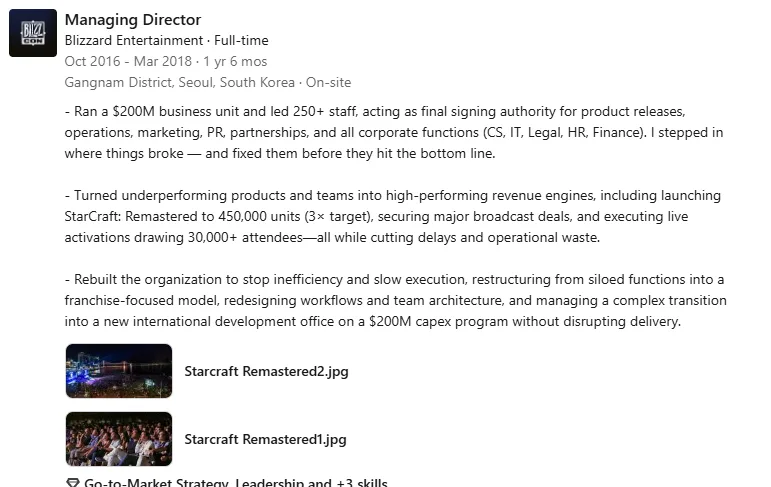 Turned underperforming products and teams into high-performing revenue engines, including launching StarCraft: Remastered to 450,000 units (3× target), securing major broadcast deals, and executing live activations drawing 30,000+ attendees—all while cutting delays and operational waste.