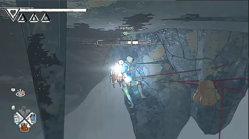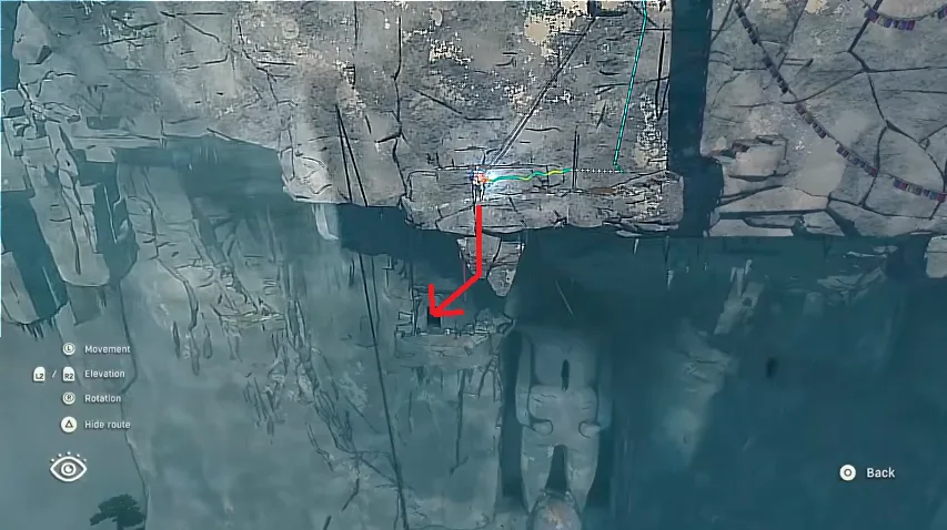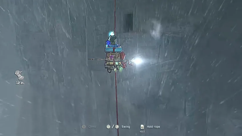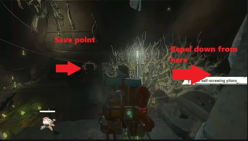 After placing the piton at the exact position I’m showing in the gameplay screenshot above, repel down because it is time to swing your way to the ledge.