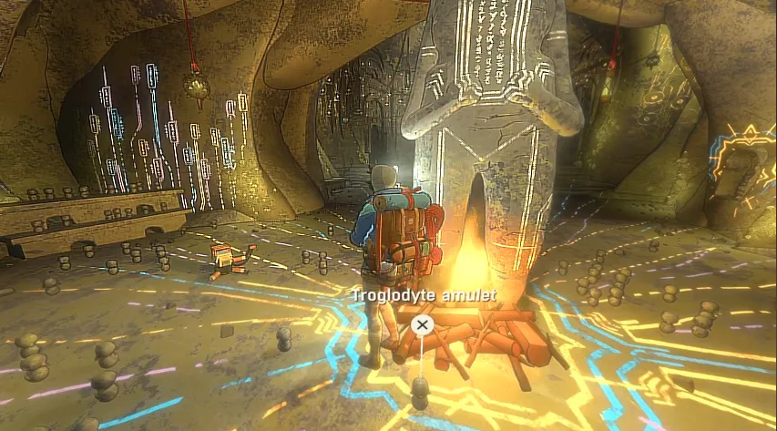 Approach the statue and press E when the prompt appears near the glowing amulet on the floor at the statue’s feet. The troglodyte keepsake will then be added to your inventory/backpack.